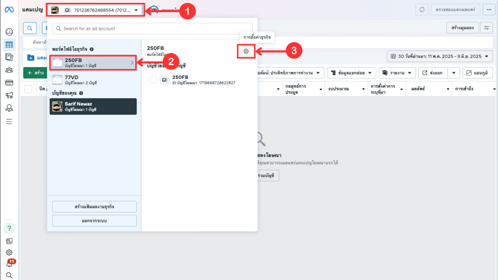 1. กดเข้าบัญชีโฆษณา >> เลือกการตั้งค่าธุรกิจ