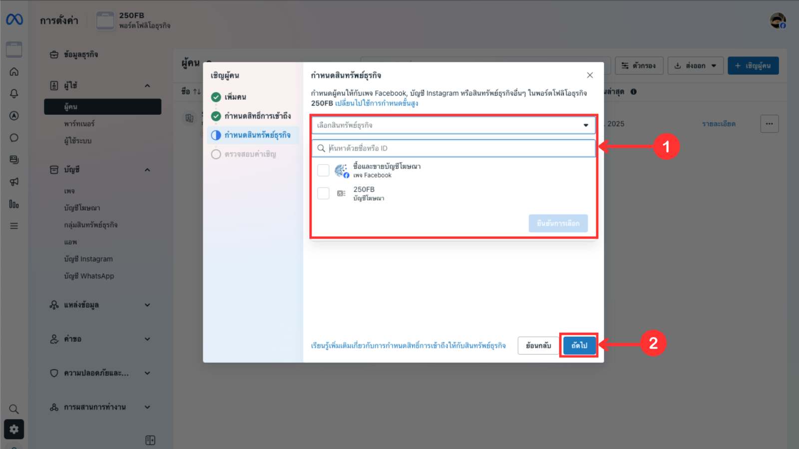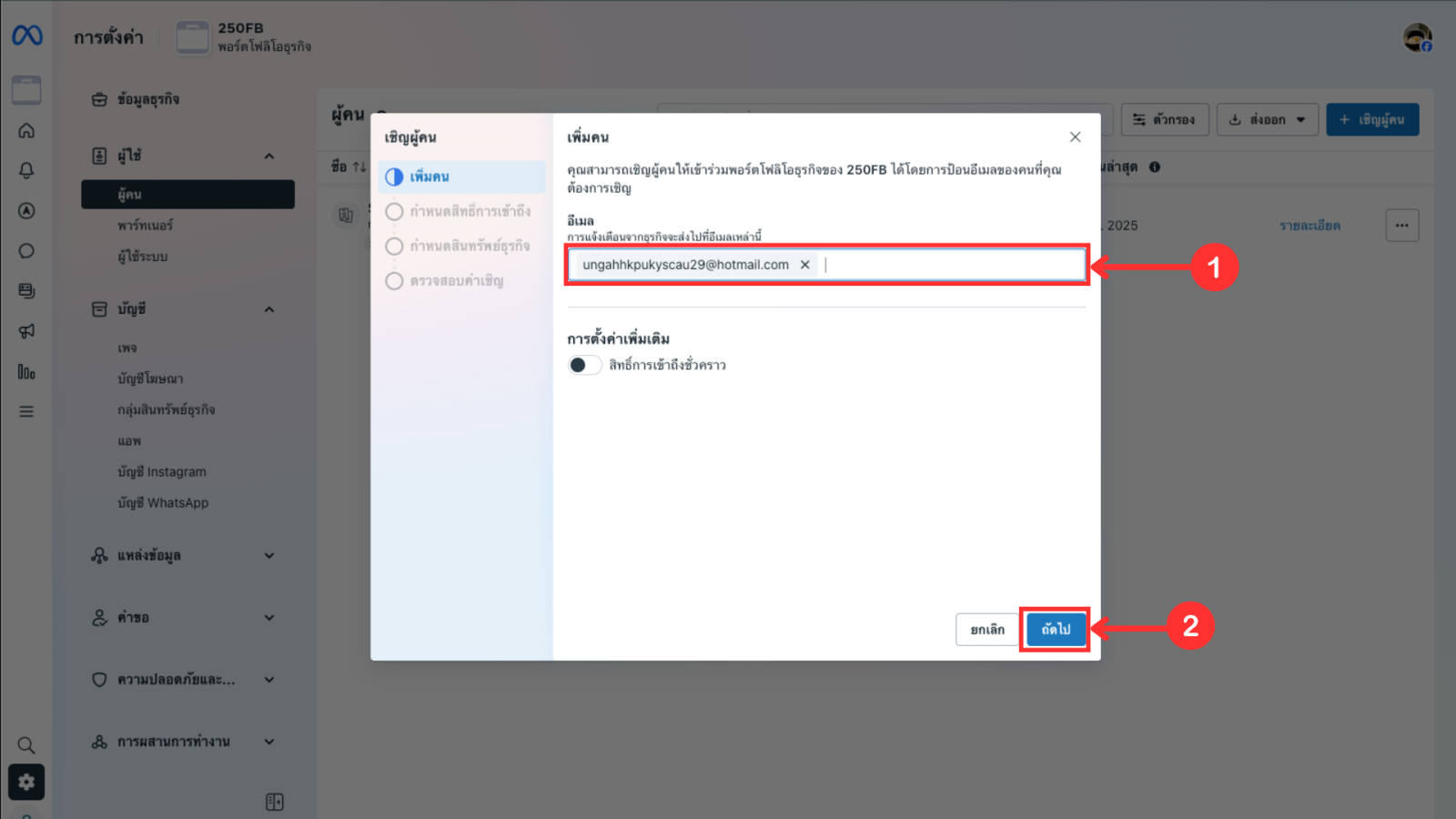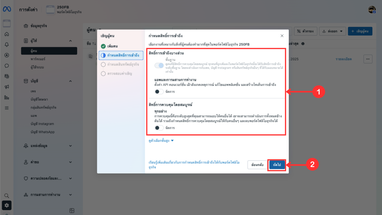 4. กำหนดสิทธิ์การเข้าถึงของบัญชีที่ต้องการเพิ่ม จากนั้นกด ถัดไป