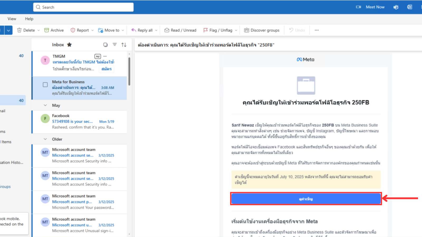 7. เข้าเมลของบัญชีที่ต้องการเพิ่ม จากนั้นคลิกข้อความในเมล เพิ่มชื่อรับสิทเข้าถึงบัญชีธุรกิจนั้นๆ เป็นอันเสร็จสิ้น