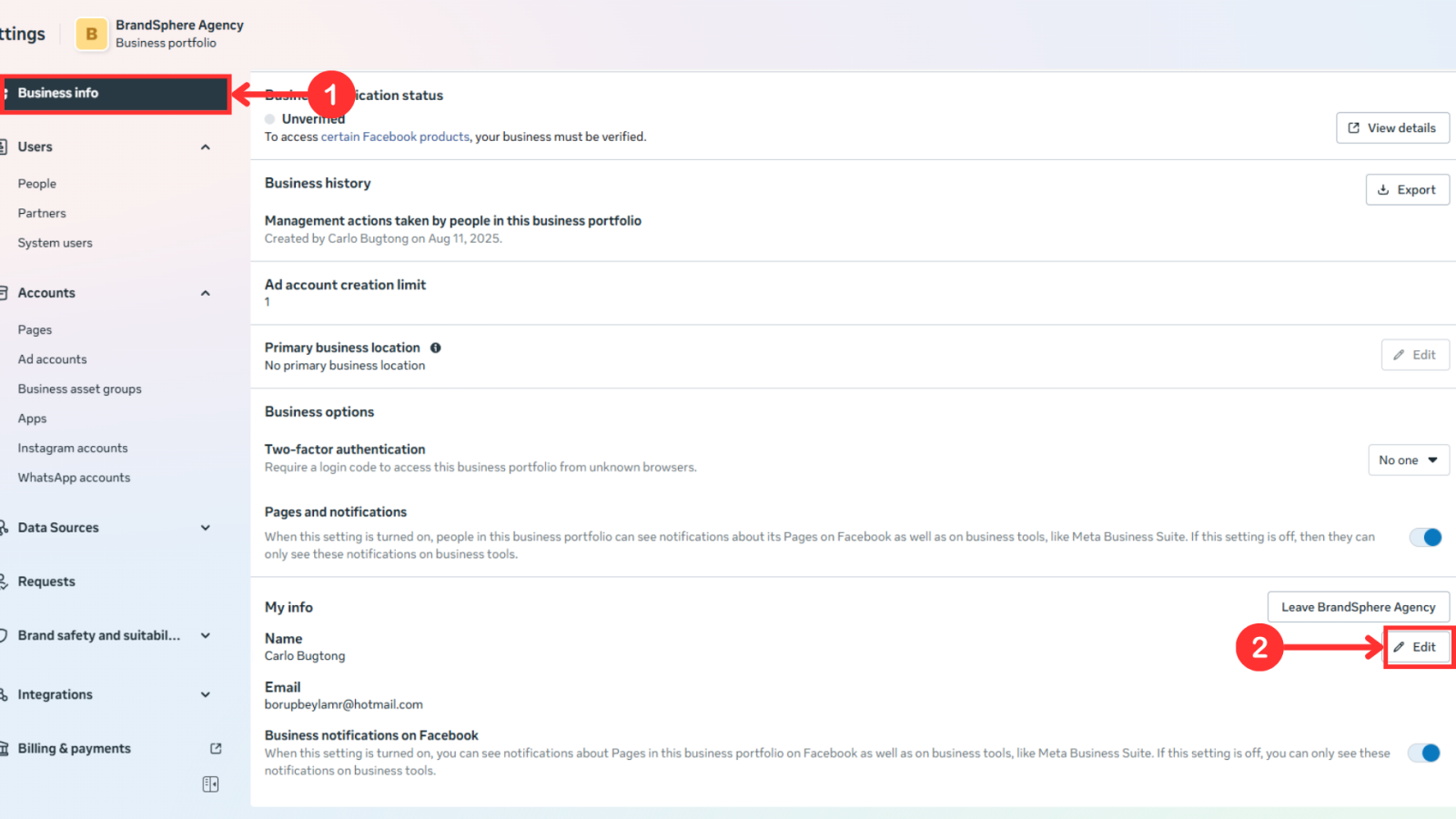 ขั้นตอนที่ 2: แก้ไขอีเมลผ่าน Business Info