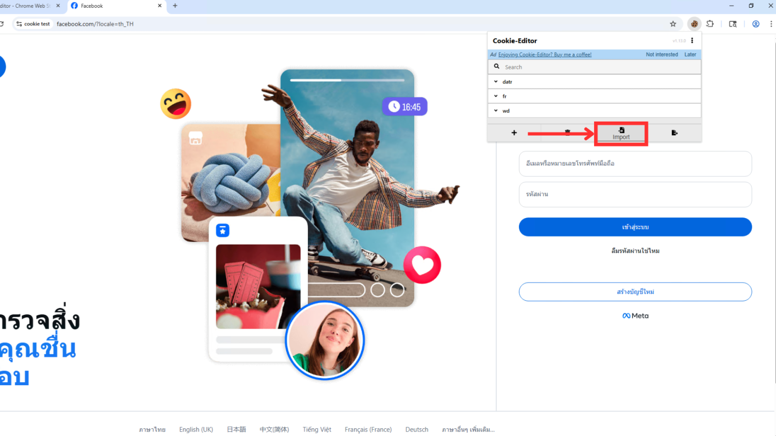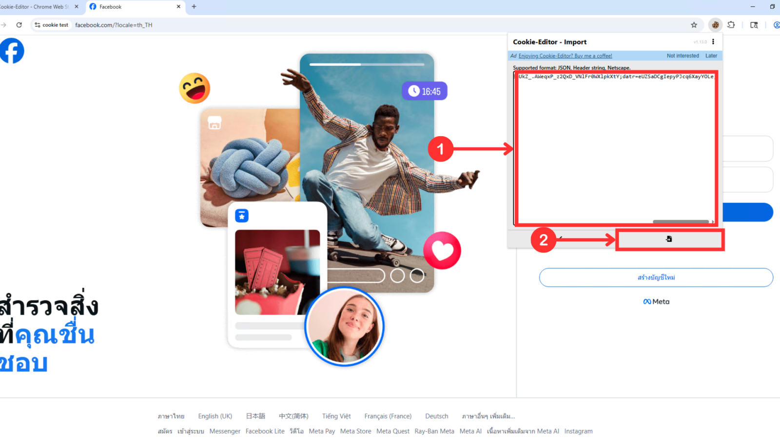 - เลือก Import จากนั้นทำการก็อปปี้ข้อมูลคุ๊กกี้ ที่ได้จากบัญชี แล้ววาง ตามรูป